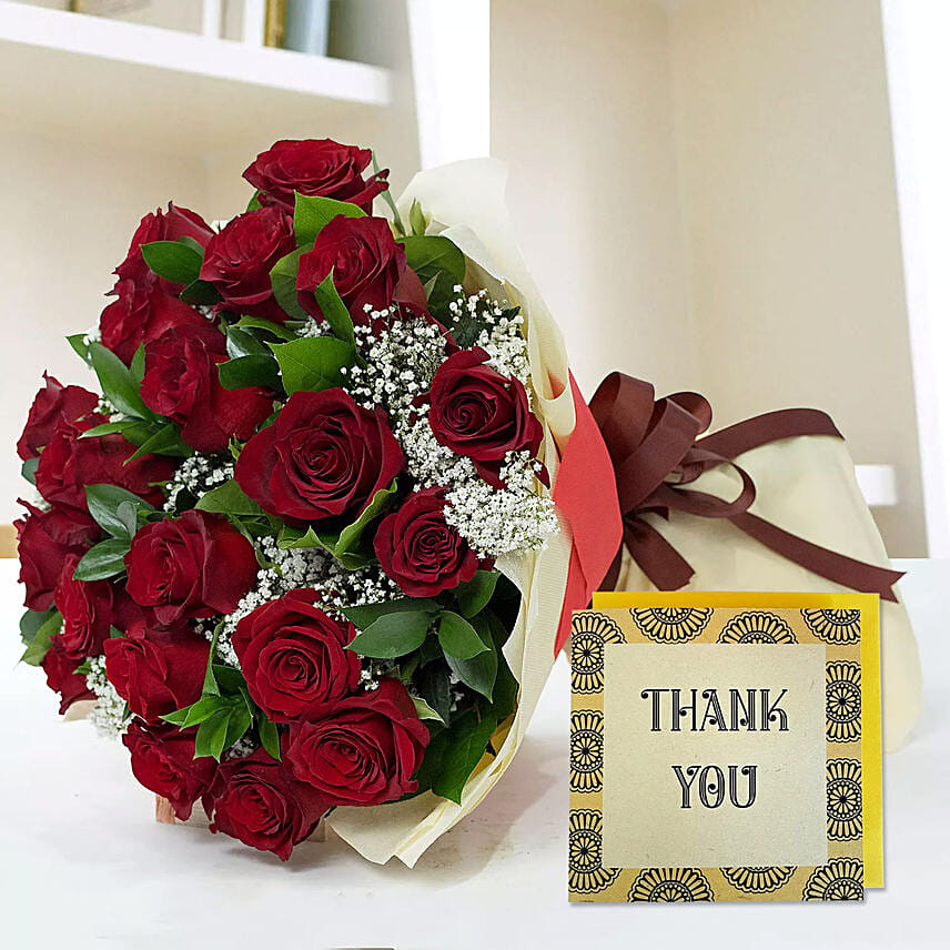 Bouquet of Red Roses & Handmade Thank You Card