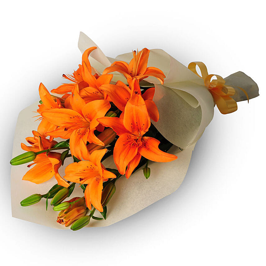 Offer a bright and colorful way of expression to your special ones in an exotic way, and let them feel pampered. This is a bunch of 6 exotic orange-colored Asiatic lilies wrapped in an off-white paper tied with a nice ribbon. So, make them feel loved and offer this bouquet of fresh flowers from Ferns N Petals, now.