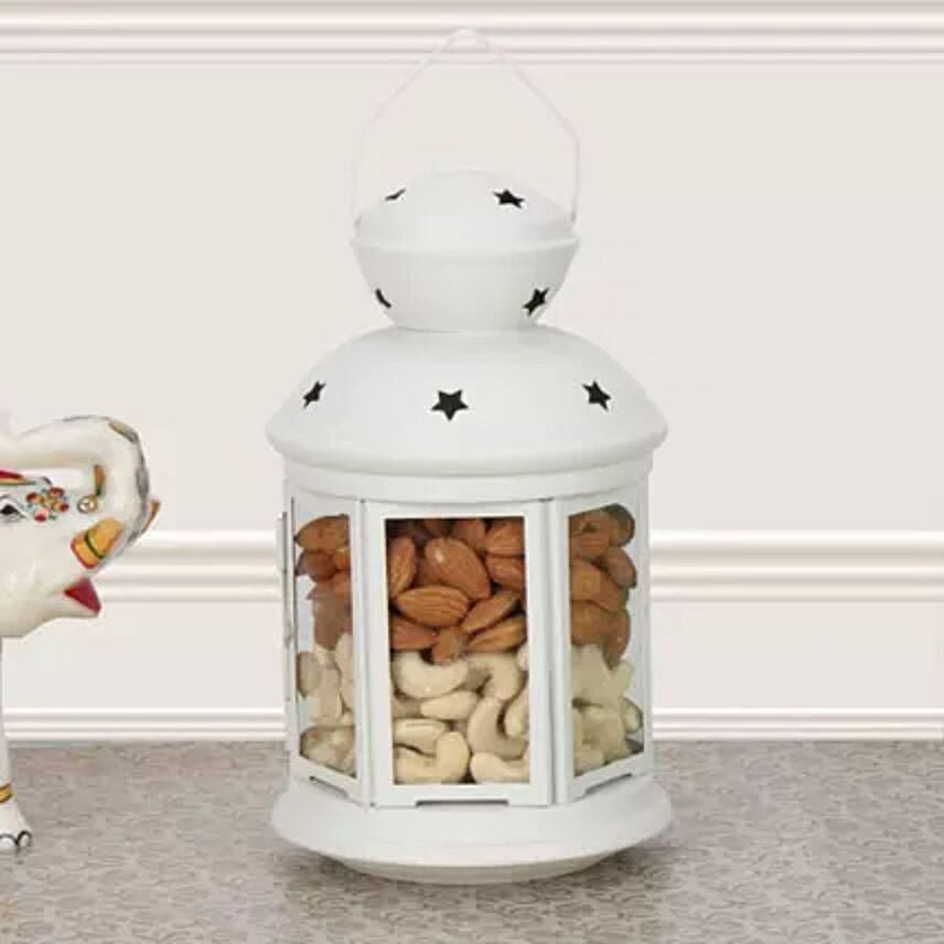 Indulge your loved ones in festive treats with this wonderful white lantern filled with almonds and cashew. Fill the special day of your loved ones with lots of sunshine and sweetness by sending this gift. Spread the true spirit of this holy festival by offering your loved ones this wonderful gift. The cute lantern shaped container is the prime USP of this gift set that would be truly loved by your friends and relatives.