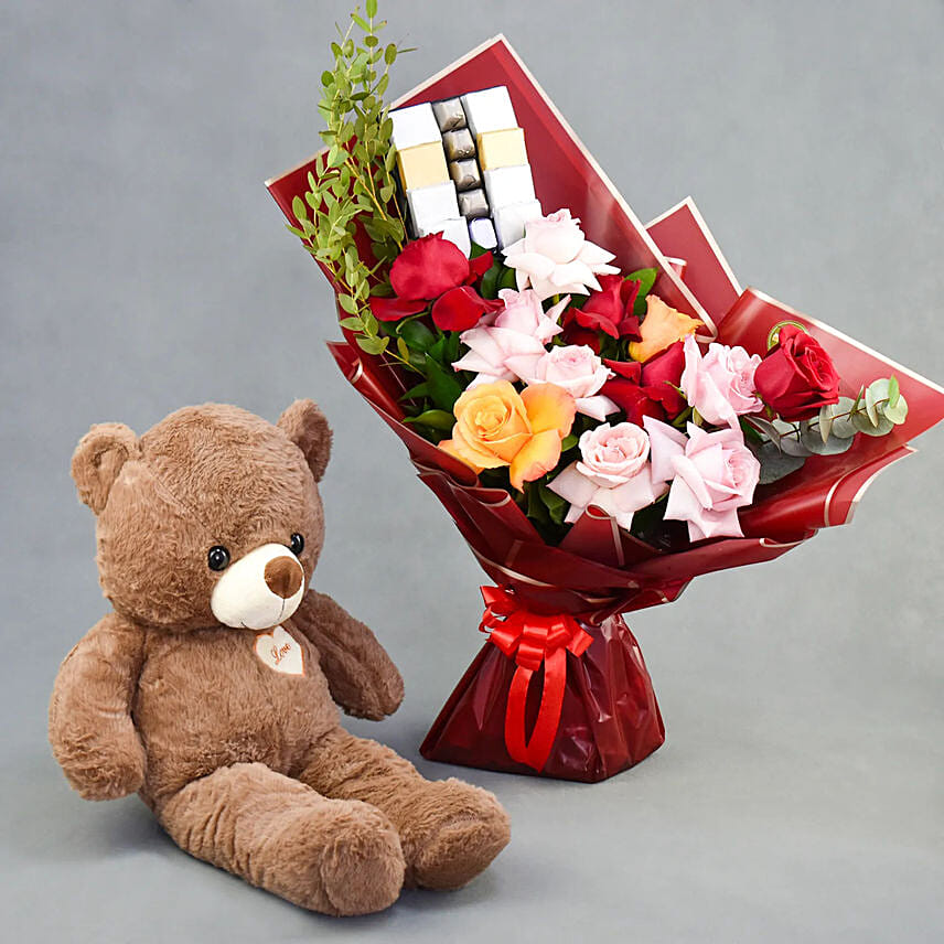 Coupled in the best shades of love, here's a bunch of blooming blossoms in the hues especially for your special one. Make them reach for stars with heavenly chocolates & a cute teddy. Each bite of chocolate and each petal of each flower is sure to brighten up their day even more.
