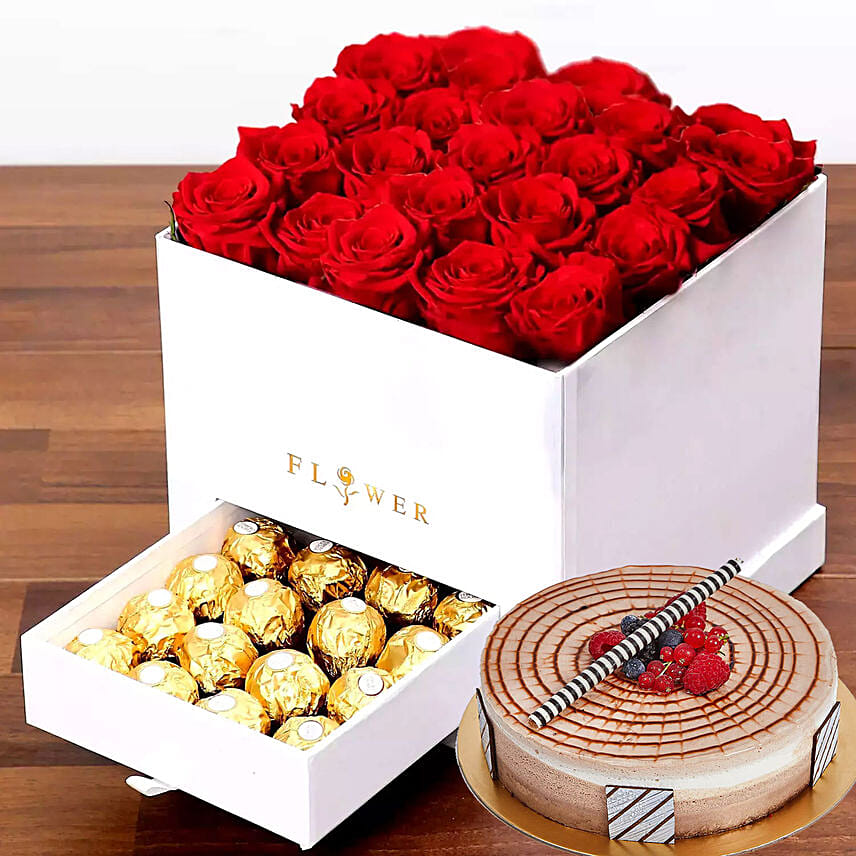 Classic Red Roses Arrangement With Triple Chocolate Cake