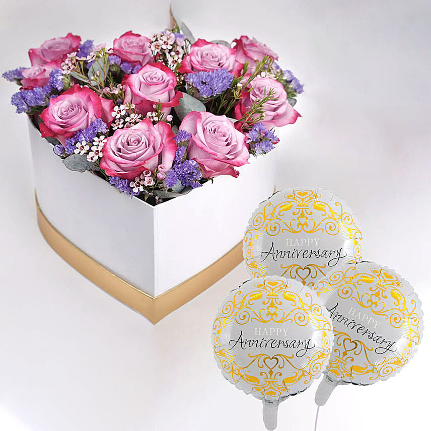 Delightful Mixed Flowers In Heart Shaped Box With Anniversary Balloons