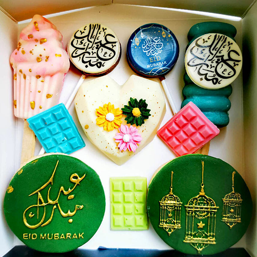• Eid Box Filled With 2 Cookies With Fondant Topper, 2 Chocolate Cakesicles, 1 Beautiful Heart With Fondant Flowers, 2 Chocolate Lollipops With Eid Chocolate Topper, 3 Mini Chocolate Bars And Marshmallows