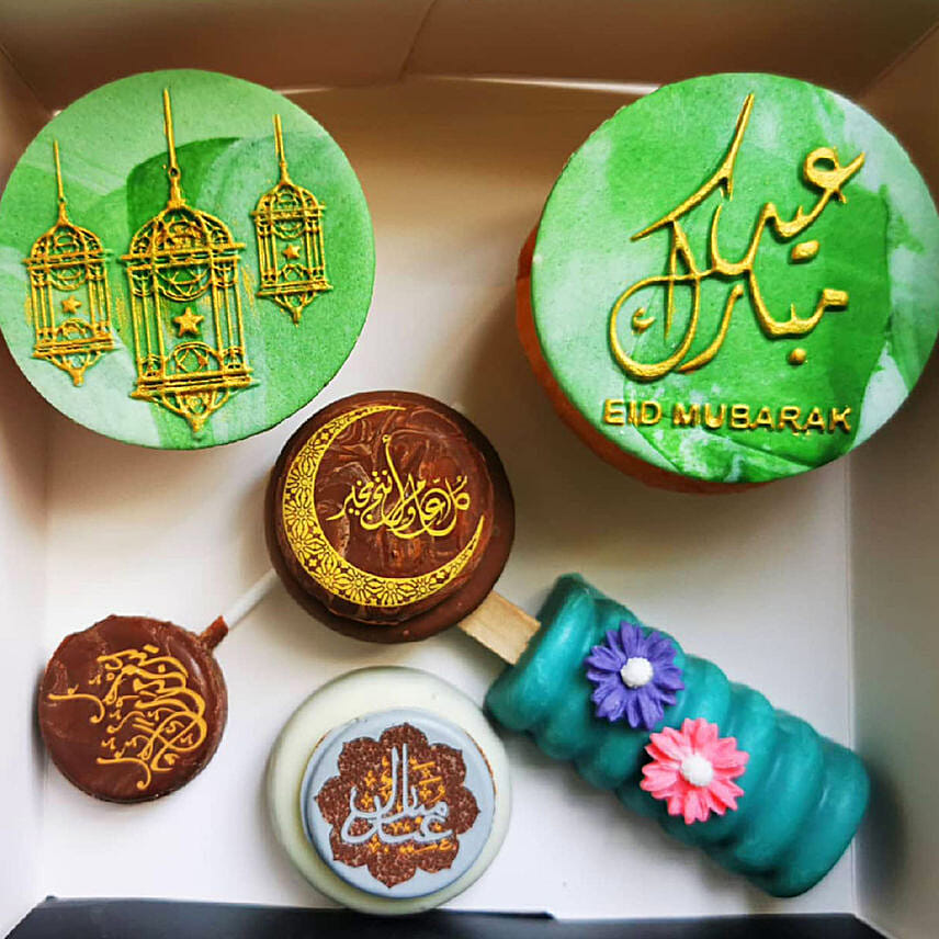 • Eid Box Filled With 2 Fondant Cupcakes, 2 Oreo Dipped With Chocolate And Eid Chocolate Topper, 1 Chocolate Cakesicle With Fondant Flower