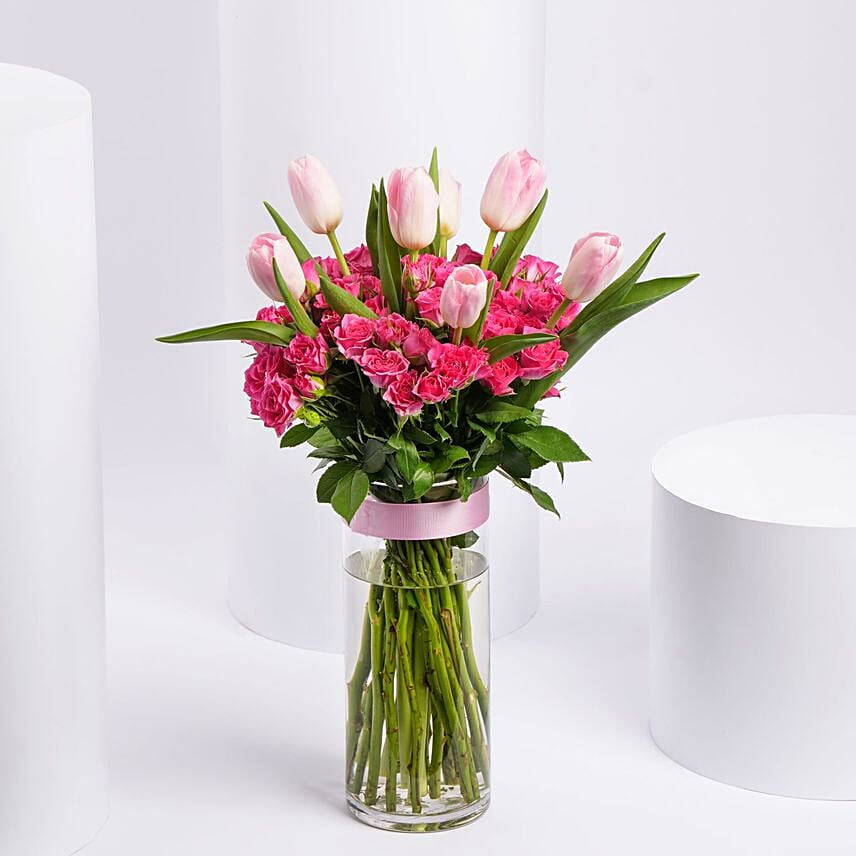 Elegant Pink Tulip & Baby Rose In Vase