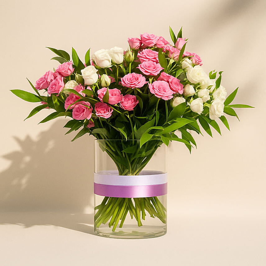 • Arranged In a Round Glass Vase and Tied with White & Pink Ribbon