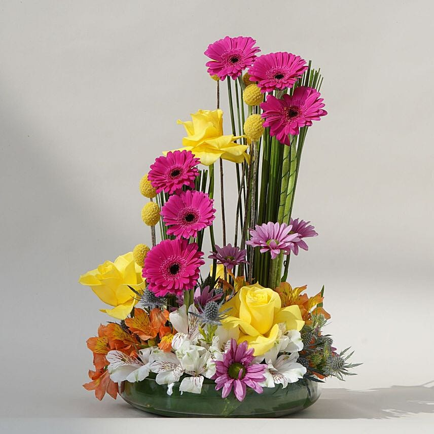 • A bright and colourful flower bunch to send ‘Good Vibes’. This rainbow-inspired arrangement will flourish for days to come, keeping the happy aura in the home alive. The flowers are handpicked and arranged with perfection to make sure they look vibrant at all times.