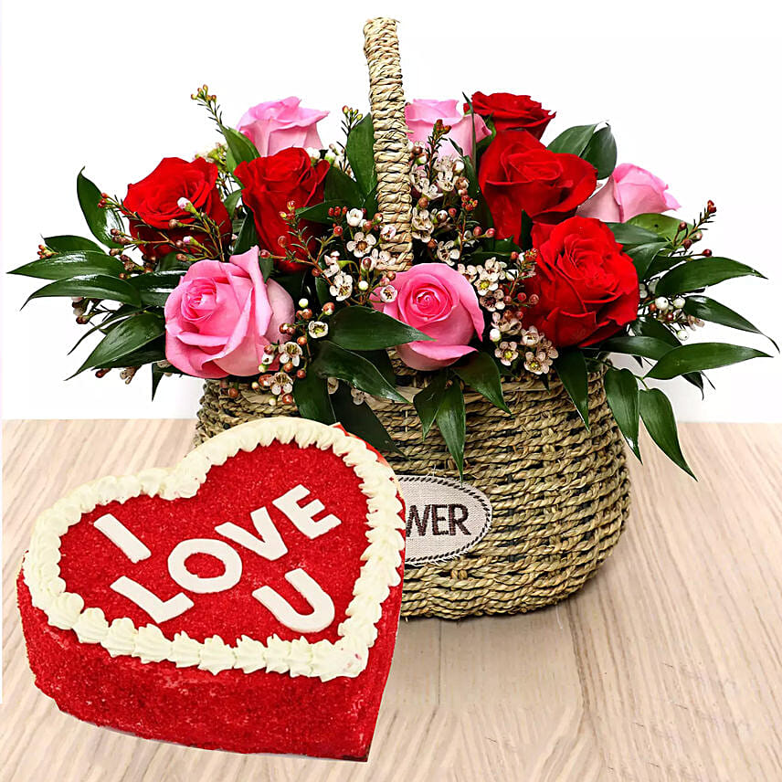 I Love You Red Velvet Cake And Roses Basket