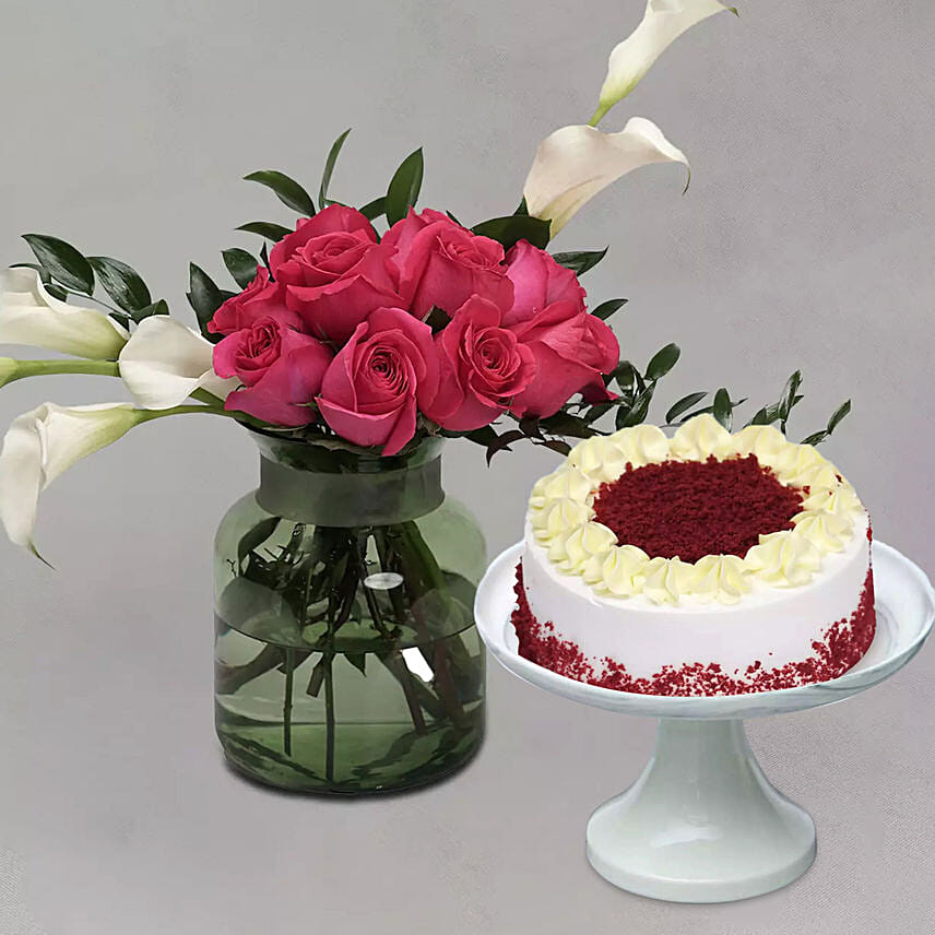 Lilies & Roses In Green Glass Vase With Red Velvet Cake