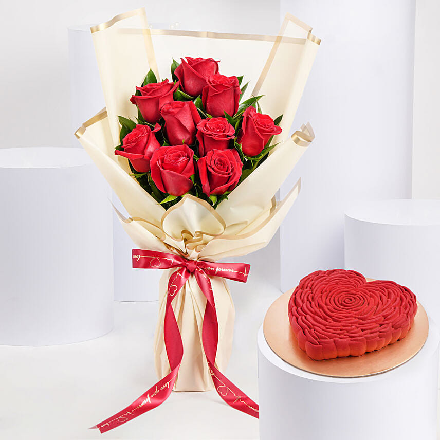 Love Expression 9 Roses Bouquet With Heart Shape Cake