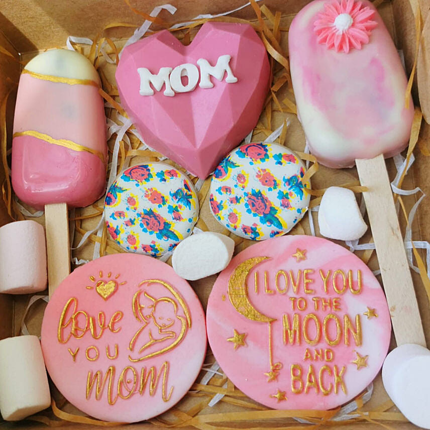 • Mother'S Day Box Filled With 2 Cookies With Fondant Topper, 3 Cakesicles, 2 Floral Chocolates And Marshmallows