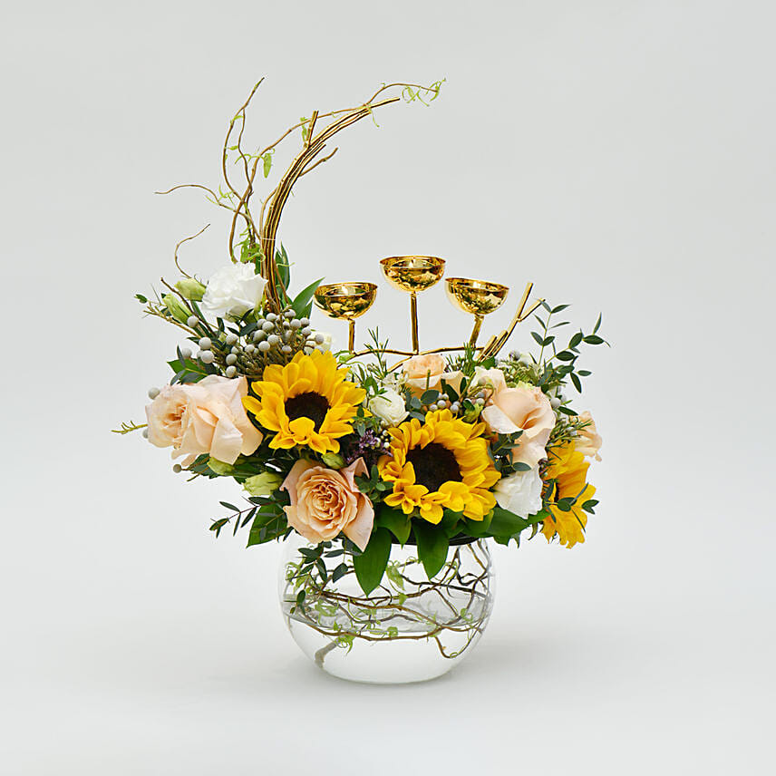 Mix Flowers in Fish Bowl with Candle Holder