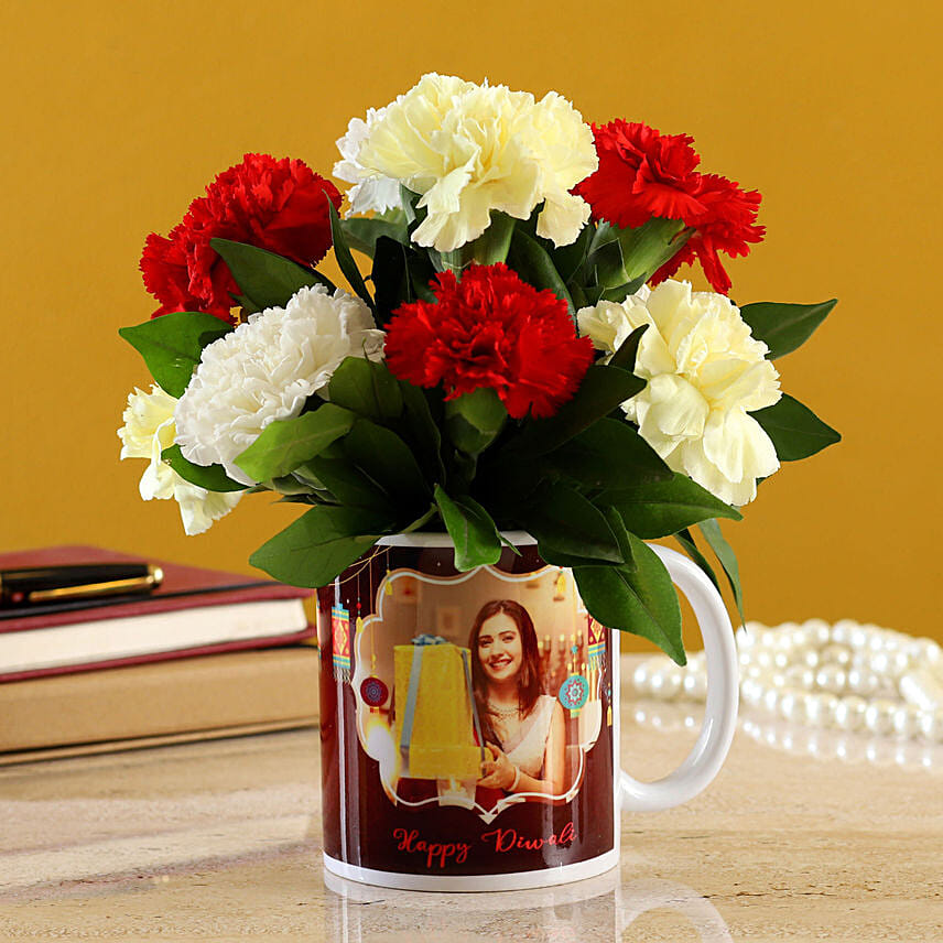 Mixed Carnations In White Mug