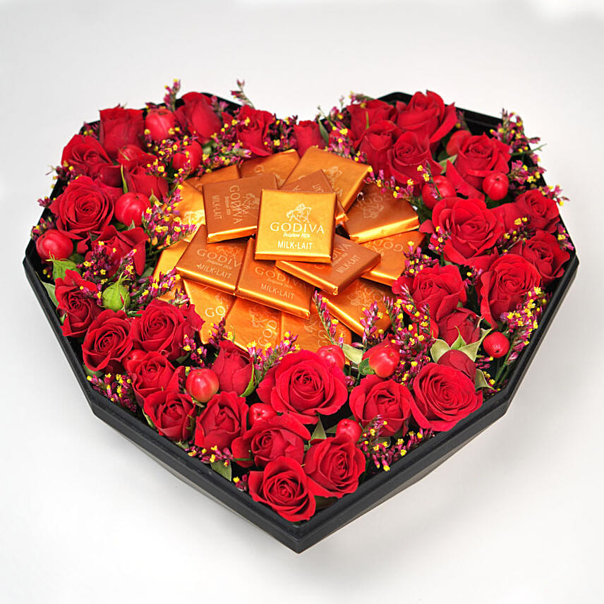 Mixed Flowers & Chocolates Heart Shaped Black Box