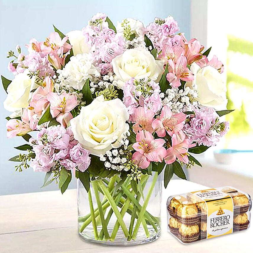 Pink and White Floral In Glass Vase With Ferrero Rocher