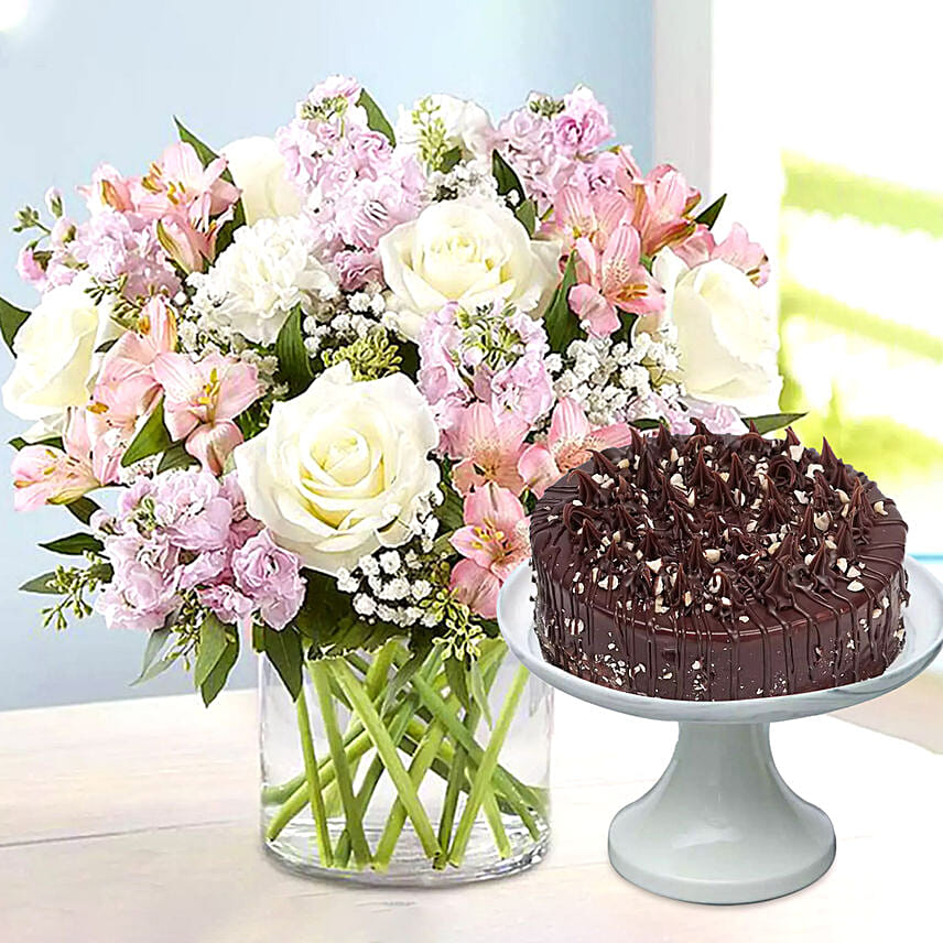 Pink and White Floral In Glass Vase With Hazelnut Cake