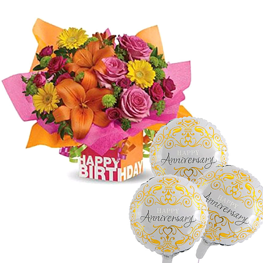 Present of Birthday Rosy With Anniversary Balloons