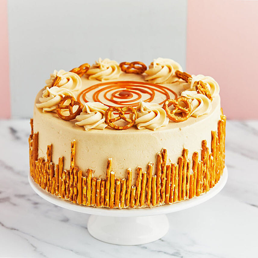 Made up of the salty-sweet contrast of caramel and pretzels! Fluffy cakes filled with white chocolate mousse and salted caramel sauce. Covered with caramel buttercream, and finished with a swirl of caramel and salted pretzels.