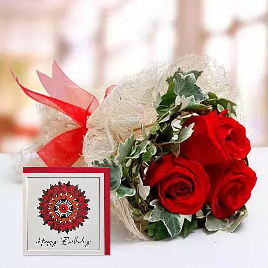 Red Roses Bouquet & Handmade Birthday Greeting Card