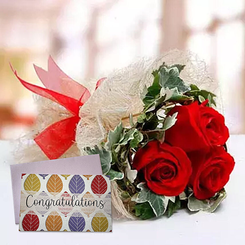 Red Roses Bouquet & Handmade Congratulations Greeting Card