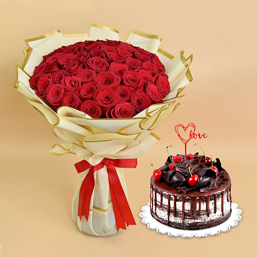 Red Roses with Black Forest Love Cake