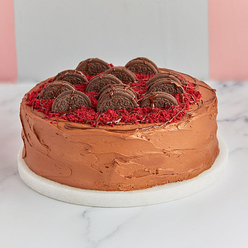 Our Irresistible Best-Selling Cake. It’S A Fluffy Three-Layered Red Velvet Sponge Filled With A Cream Cheese And Oreo Frosting, And Covered With Chocolate Fudge And Finished With Red Velvet And Oreo Cookie Crumbs