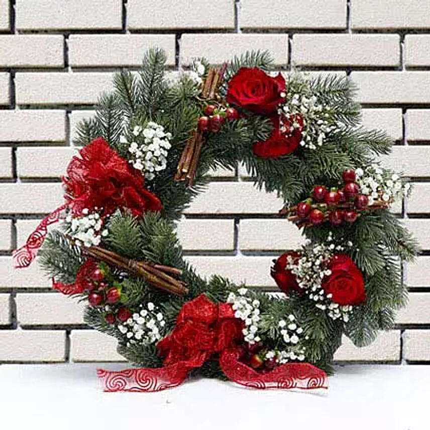 Fresh Flowers Wreath Contains - Noblus Blue wreath decorated with 8 Red Roses, Red African Berries with Gypsophila and Red Glitter Ribbon Bow is a perfect idea for gifting flowers to someone on the special occasion of Christmas. It can easily add glitters to the celebration of any festive occasion. Go for it and take your home décor to a new level.