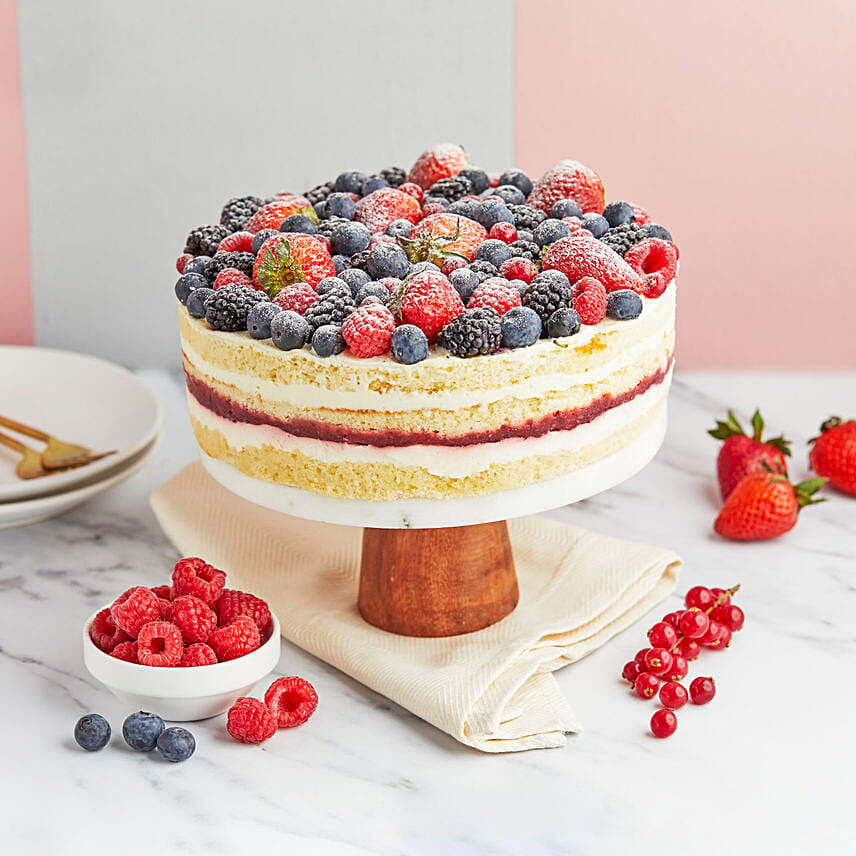 An Absolutely Delicious And Beautifully Rustic, Fluffy Vanilla Cake Filled With Vanilla Cream And Fresh Strawberries, And Topped With A Selection Of Fresh Berries