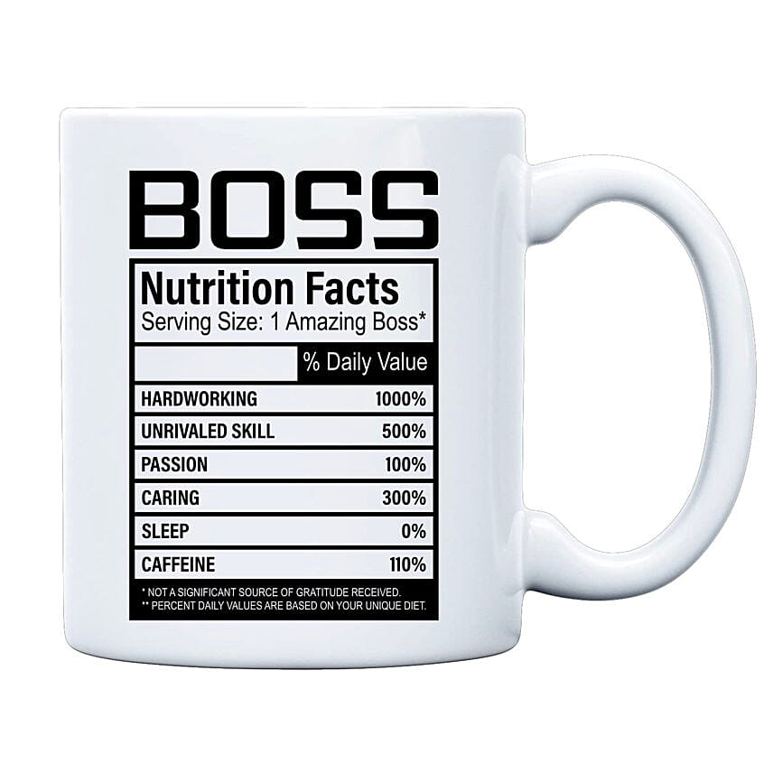 Give your boss the gift of humour and appreciation along with a blend of style and functionality. This mug is adorned with a delightful twist, featuring a humorous "Nutrition Facts" label showcasing the unique ingredients that make your boss exceptional. This stylish and functional mug not only adds flair to the pace but also brings a daily dose of laughter. The perfect boss day treat