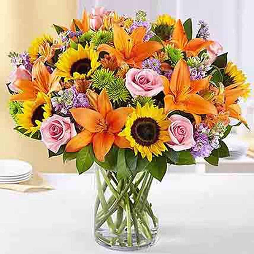 Vibrant Bunch of Mix Flowers In Glass Vase