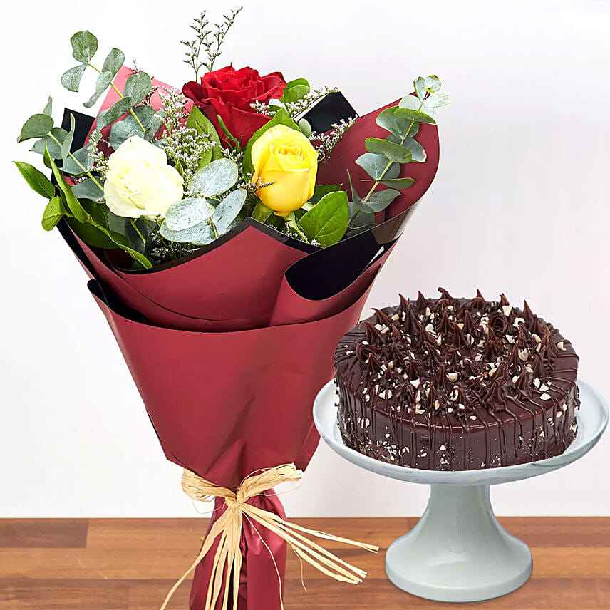 Vibrant Colored Roses Bouquet With Hazelnut Cake