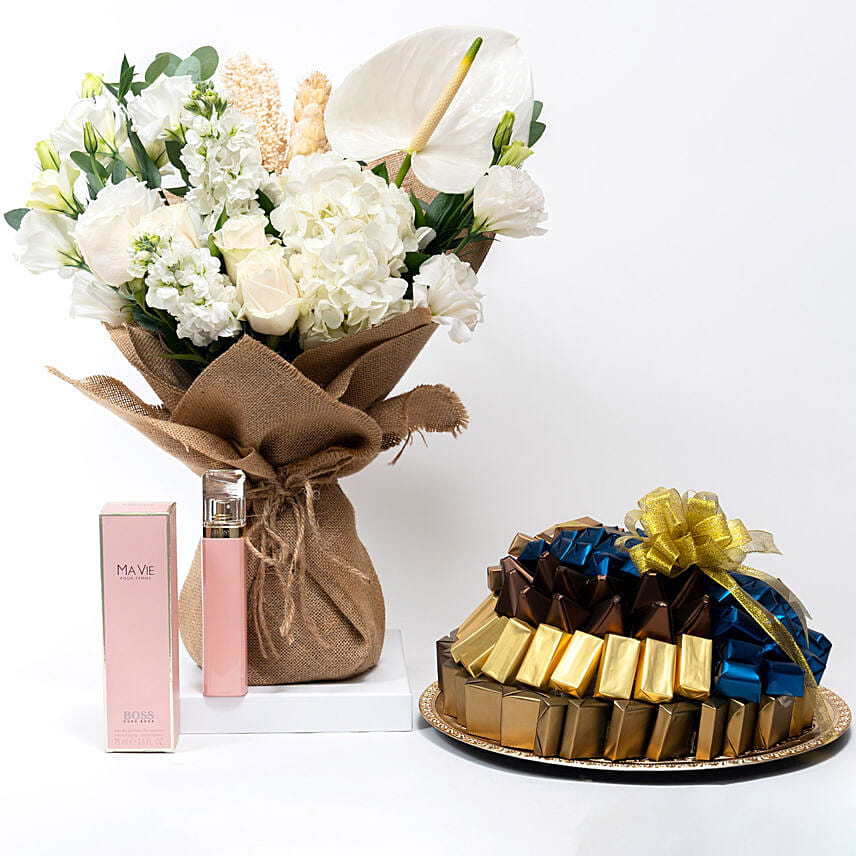 White Flowers Bouquet with Perfume and Chocolate