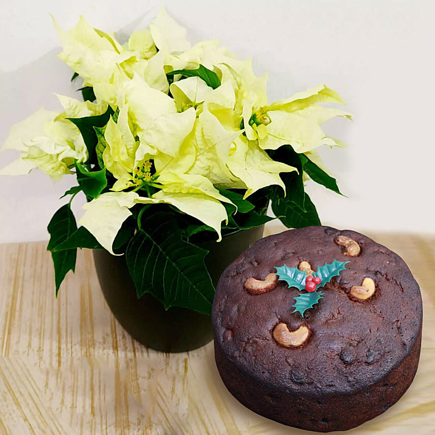 White Poinsettia Plant With Plum Cake