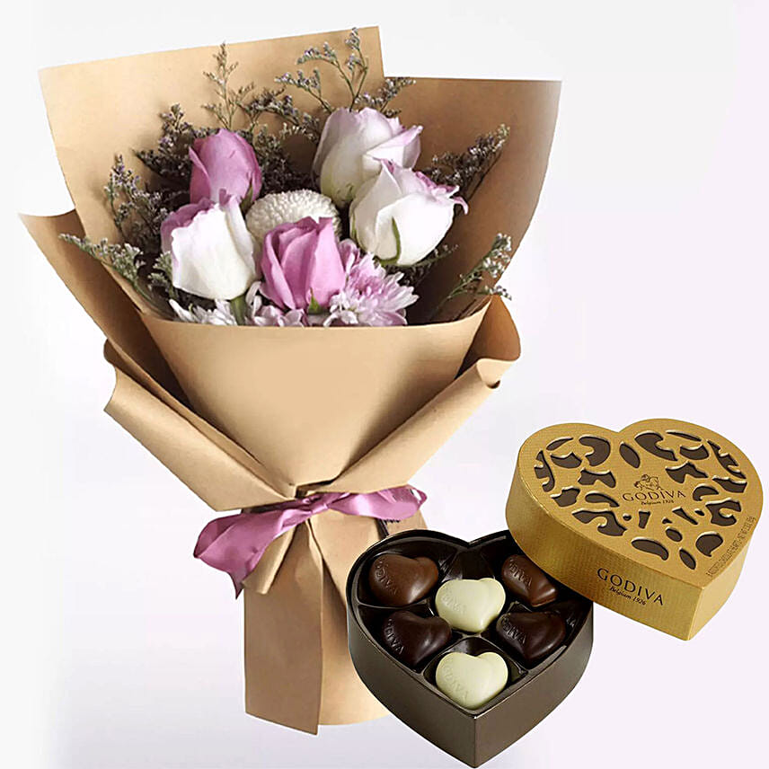 White Purple Flowers & Godiva Chocolates 250 gms