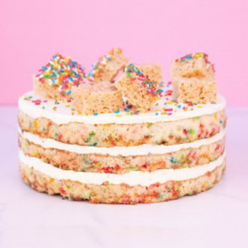 A Funfetti Filled Cake With A Velvety White Chocolate Mousse Topped With Rice Krispies! This Is The Lightest Funfetti Cake You Will Ever Taste, You Might Just Eat The Whole Cake In One Sitting!