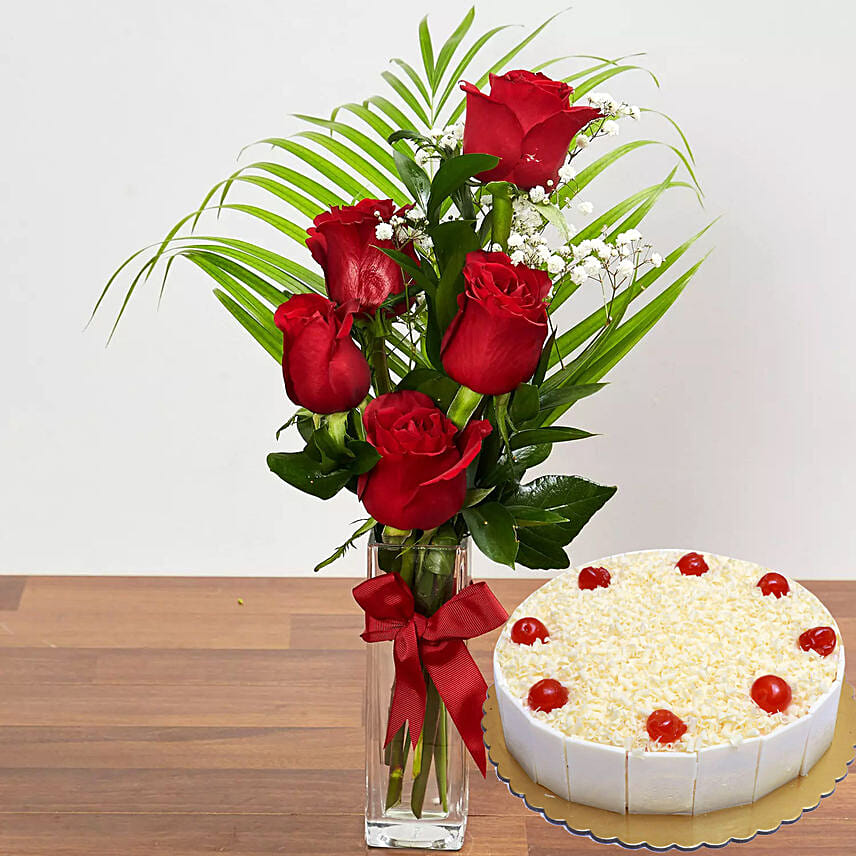 5 Red Roses & White Forest Cake 8 Portions