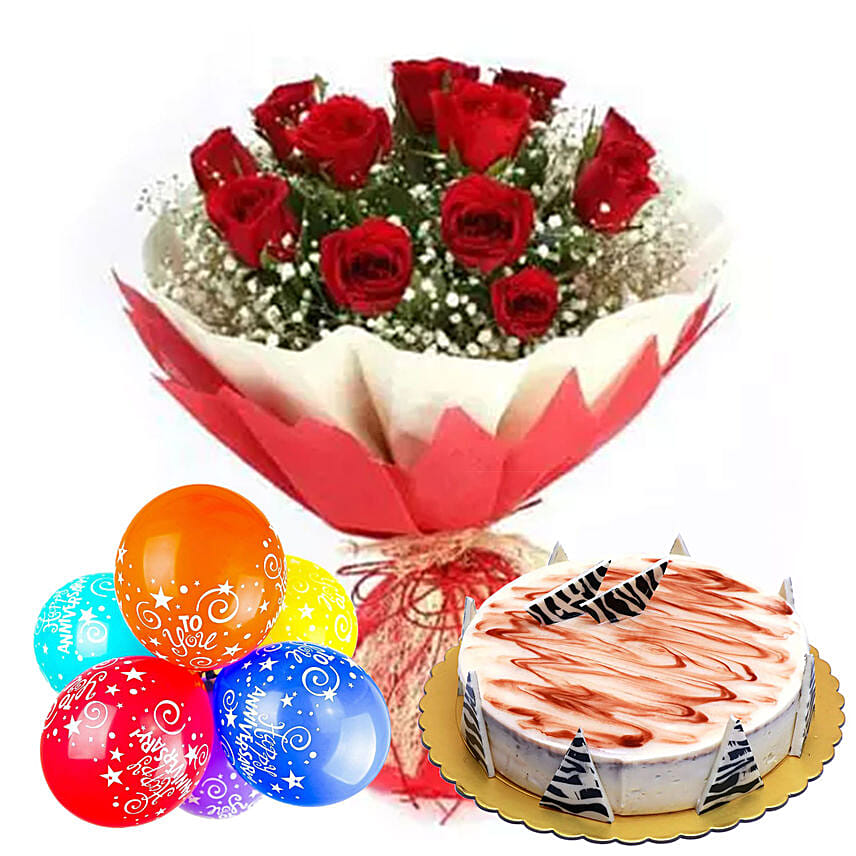 Anniversary Wishes with Cake & Red Roses