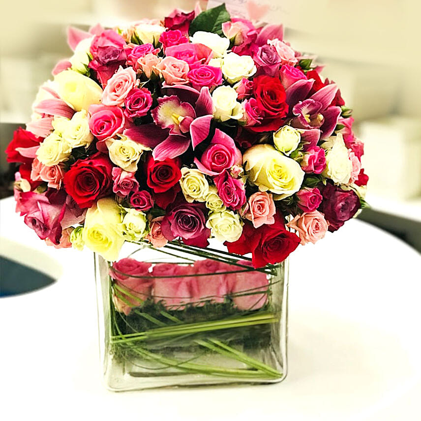 Blooming Mixed Roses & Cymbidium Vase Arrangement