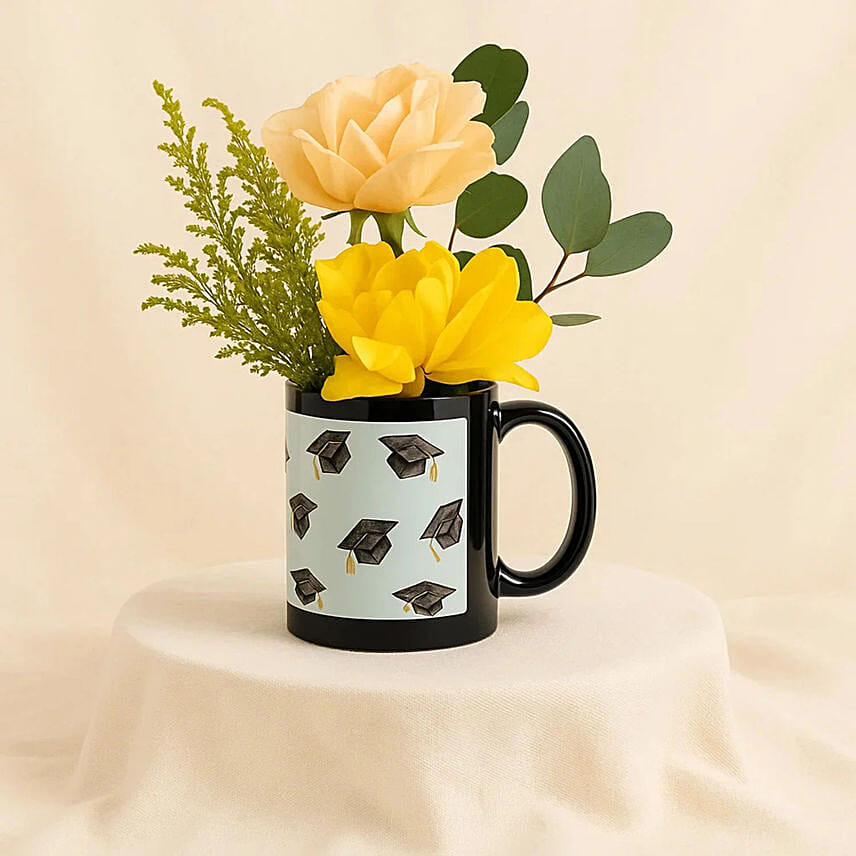 Celebrate your graduation achievement with this special graduation bouquet from FNB! It includes a combination of bleft roses and an elegant mug, making this the perfect gift to honor your favorite graduate. Each bouquet includes: