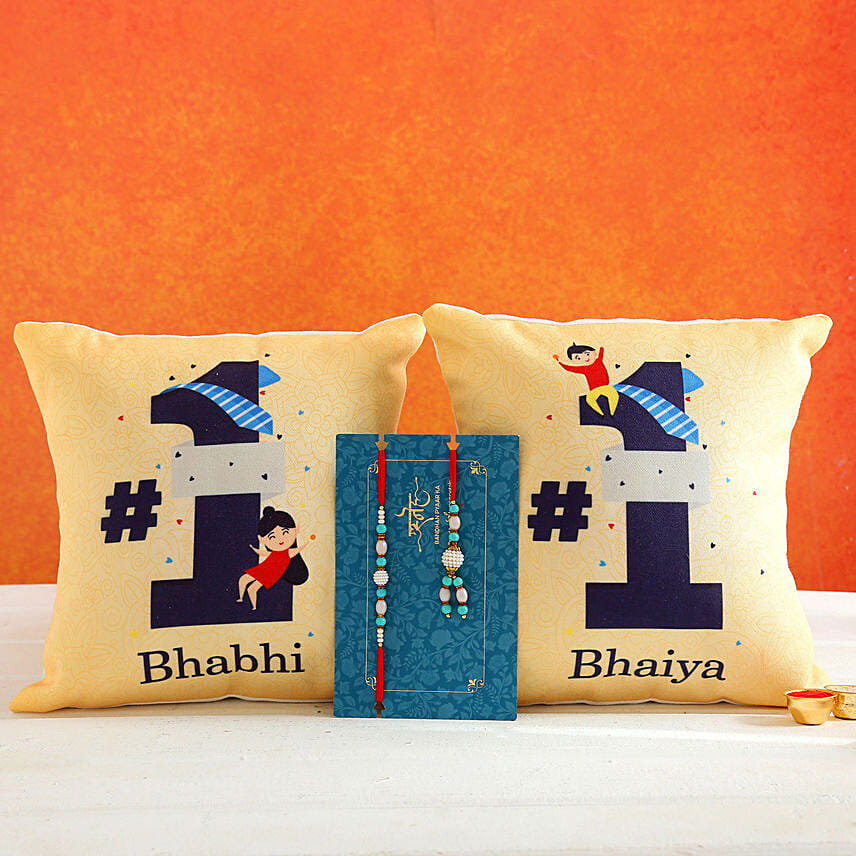Blue Lumba Rakhi Set And 2 Bhaiya Bhabhi Cushions