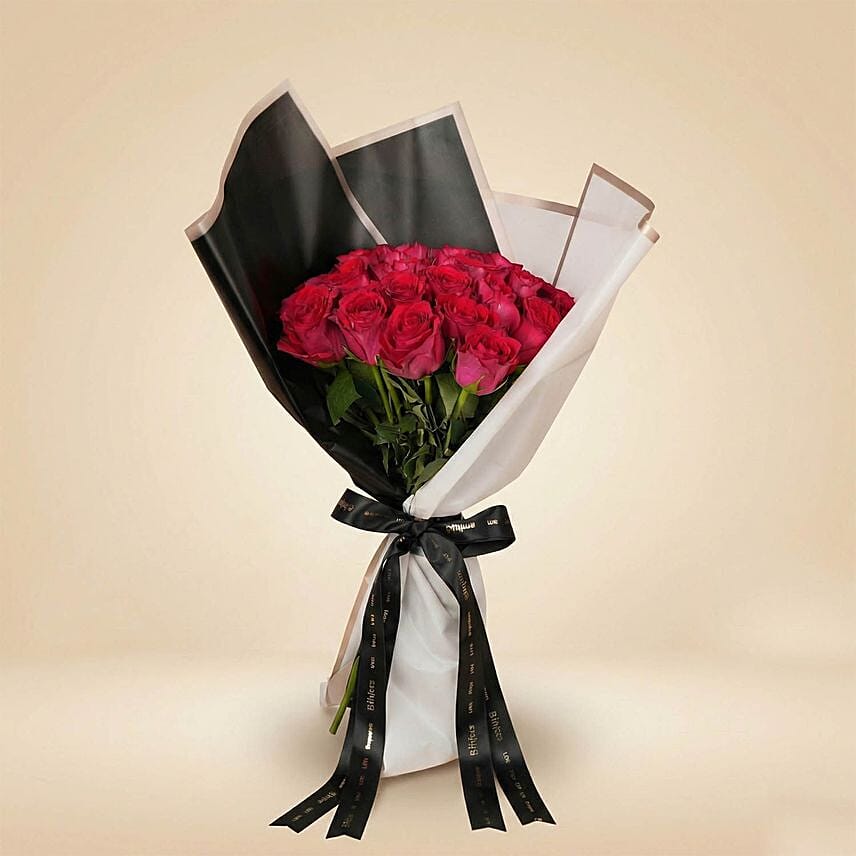 This arrangement features dark pink roses, symbolizing admiration, gratitude, and gentle affection. Each bloom is carefully hand-arranged and wrapped in a striking combination of black and white wrapping, creating a modern, luxurious contrast that instantly catches the eye.