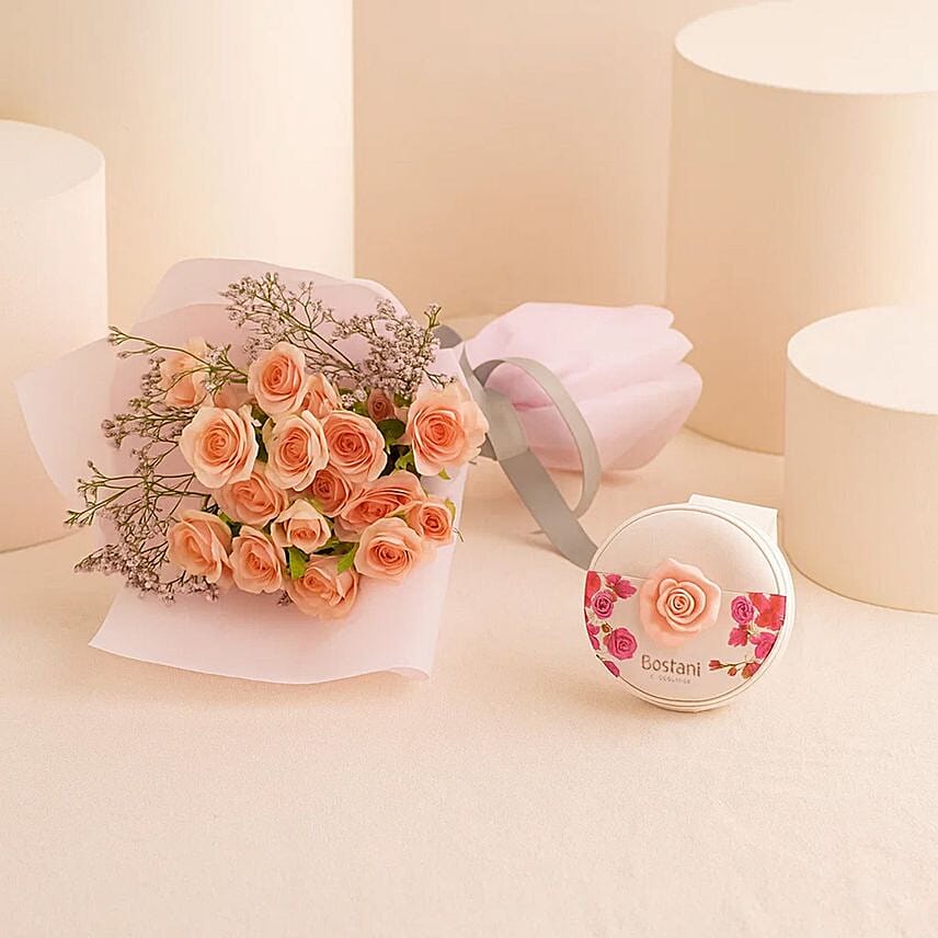 Surprise your loved ones with the beauty of Bostany Rose chocolates with an elegant double-colored pink rose bouquet. The Bostany Rose collection combines elegance, love, and exceptional taste in every piece. This luxurious round box comes with 3D pink chocolate detailing, making it the perfect gift for a loved one on a birthday, anniversary, or any special occasion. Comes in a gift combo containing:
