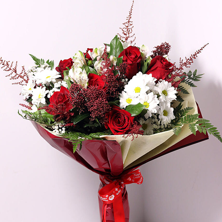 • Leaves and Fillers - Leather Fern and Baby Breath in a dual color wrapping and christmas ribbon