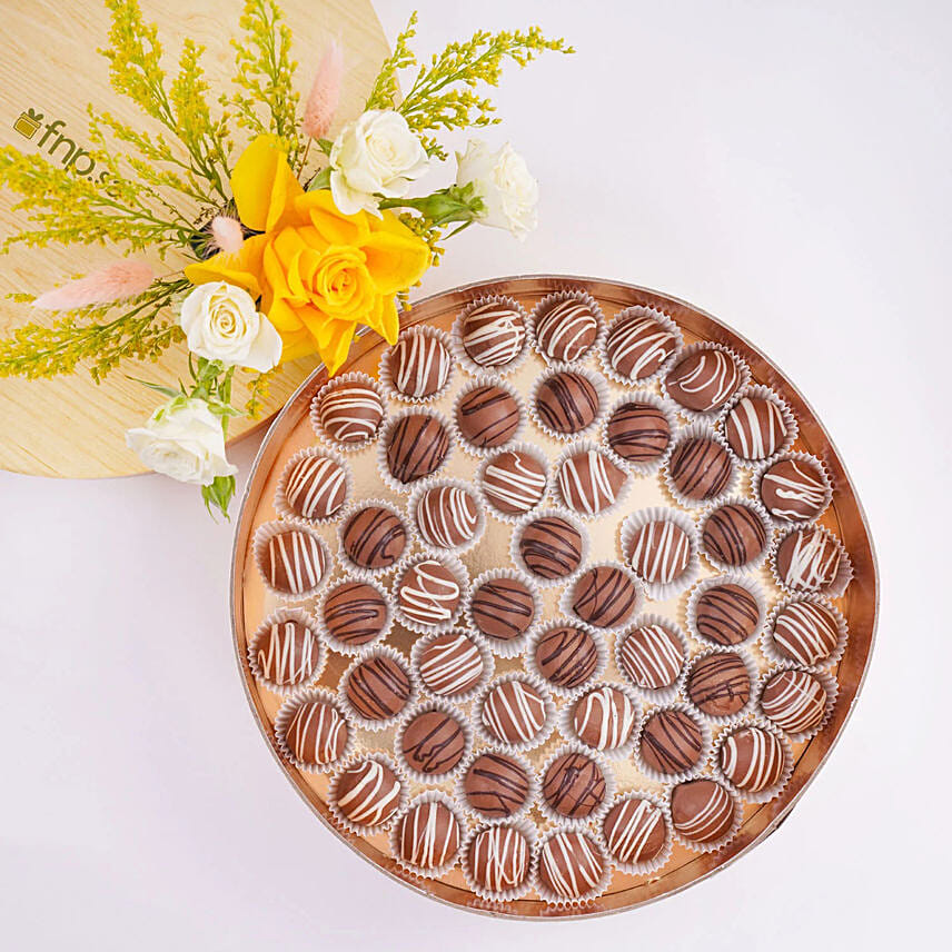 Celebrate in elegance and express your feelings in the most beautiful way with rich and luxurious chocolate truffles, accompanied by the most beautiful natural roses in delicate colors and an enchanting view. Arranged in an elegant tray, it makes the perfect gift for birthdays, special occasions, or just to please a loved one.