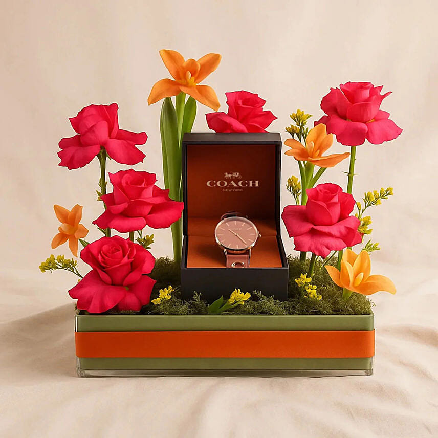 Give her an embrace of complete elegance with Coach Women's Wristwatch with Fuchsia Rose and Tulip Tray. This exquisite combo combines the elegance of a luxury Coach watch with a stunning rose arrangement, making it the perfect gift for the modern woman who appreciates fashion and nature.