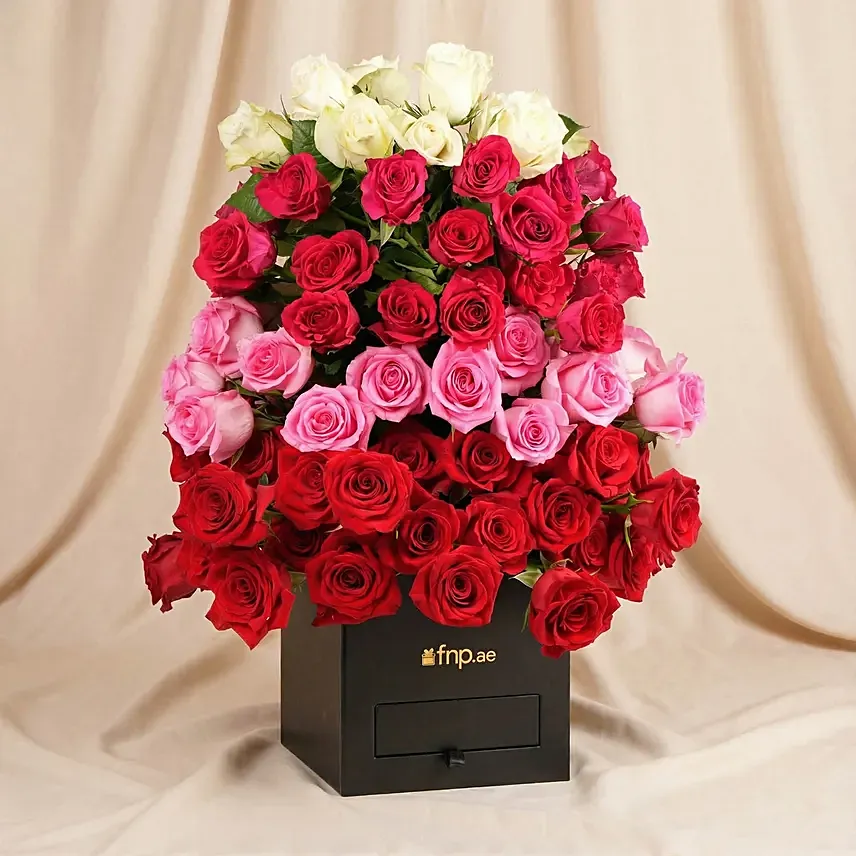 A luxurious floral arrangement that brings together the most expressive shades of love and elegance. This beautifully designed rose box blends passion, softness, and purity into one striking display, making it a meaningful gift that speaks from the heart.