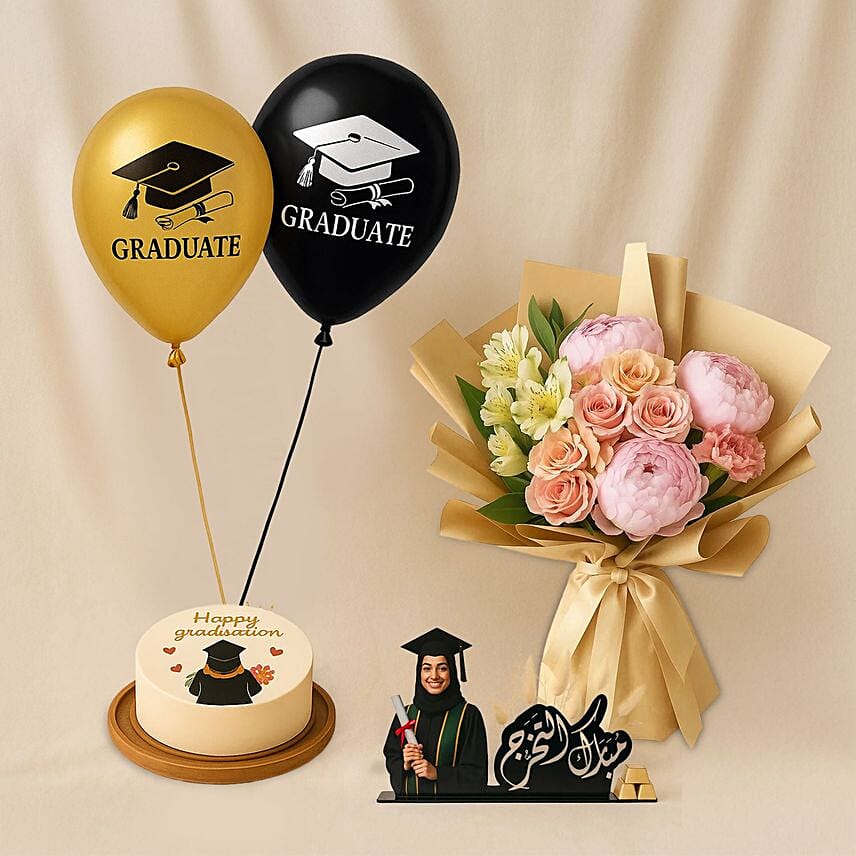 Celebrate the great achievement and the end of the journey with the complete graduation gift set for girls. Includes the most delicious graduation cake for girls with a special personalized congratulations print, an elegant peony and soft rose bouquet, graduation balloons, and a Congratulations on Graduation desktop gift—the perfect graduation gift for girls that s sure to impress!