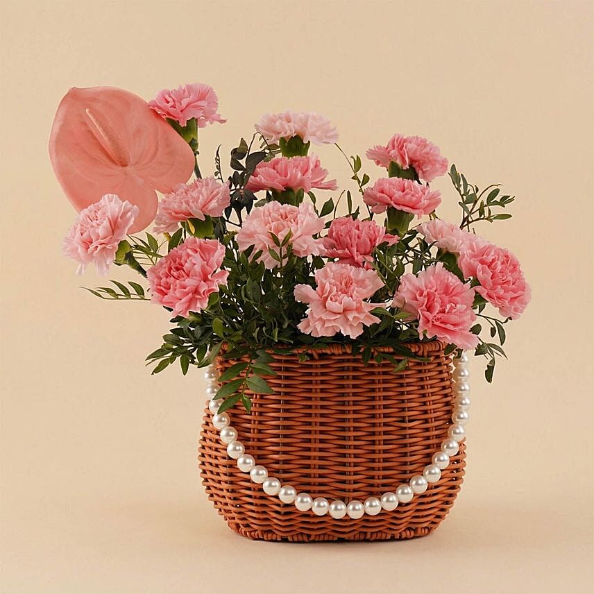 An elegant flower basket that radiates softness and sophistication, featuring delicate pink carnations beautifully arranged with fresh greenery. A perfect choice for refined occasions or to express love and appreciation with a graceful touch that captivates both the heart and the eyes.