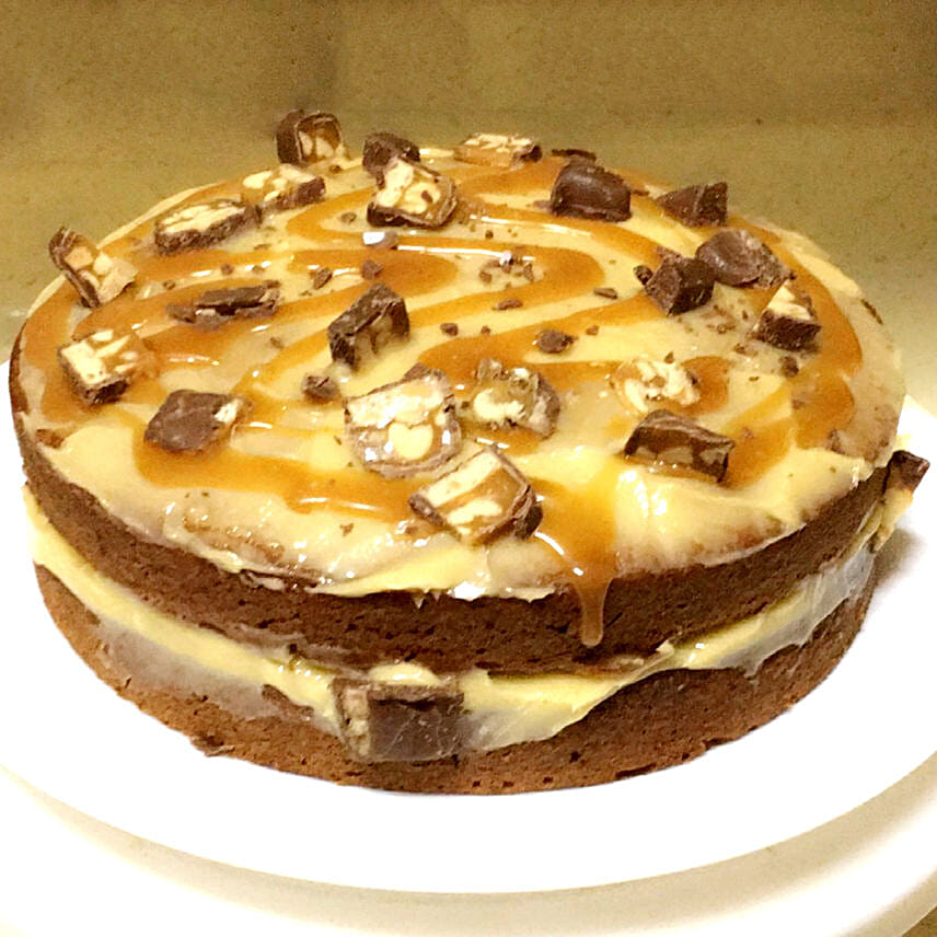 • Snickers Caramel Cake With A Peanut Nougat Filling, Covered In A Caramel Buttercream And Topped With A Caramel Sauce And Chopped Snickers Bars