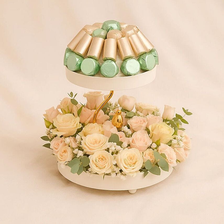 Impress your loved ones with the luxurious Patchi chocolate dome from FNP. Its beautiful presentation with a white and peach rose bouquet makes it the perfect gift for a birthday, anniversary, Mother s Day, housewarming, or corporate events. Order it today!